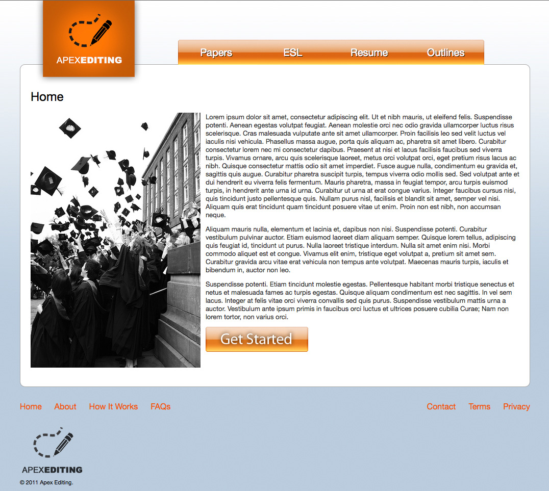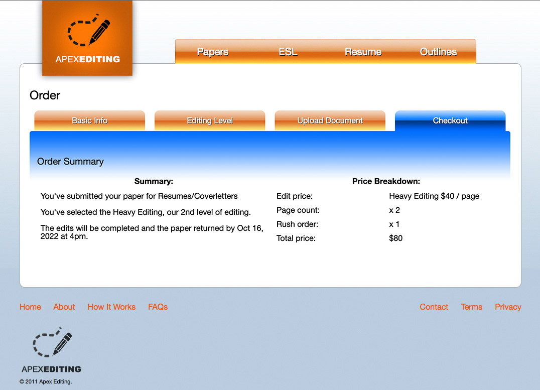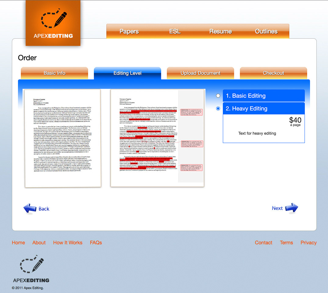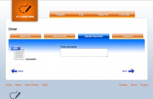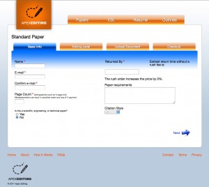 This company professionally edits technical papers, resumes, ESL among other. The site requires that a user upload a file and pay through Paypal. The price is determined based off of paper type, number of pages, and desired due date. The backend is WordPress and includes a custom and very powerful plugin which allows the admins to manage papers.